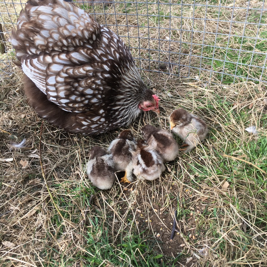 The darkest brown eggs on the farm come from our newest addition, the French Silver Cuckoo Maran.